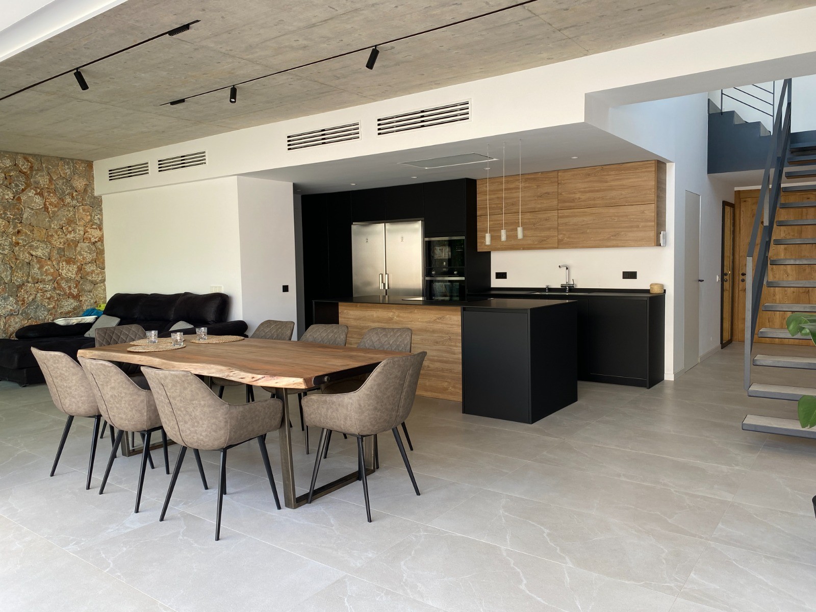 Esta vivienda dispone de instalación de suelo radiante y splits, mediante un sistema de aerotermia, también dispone de un sistema de autoconsumo de 9 kwp y todo gestionado por un sistema de control que de manera muy eficiente evita inyectar excedentes a la red, subiendo consignas de temperatura y encendiendo depuradoras etc.